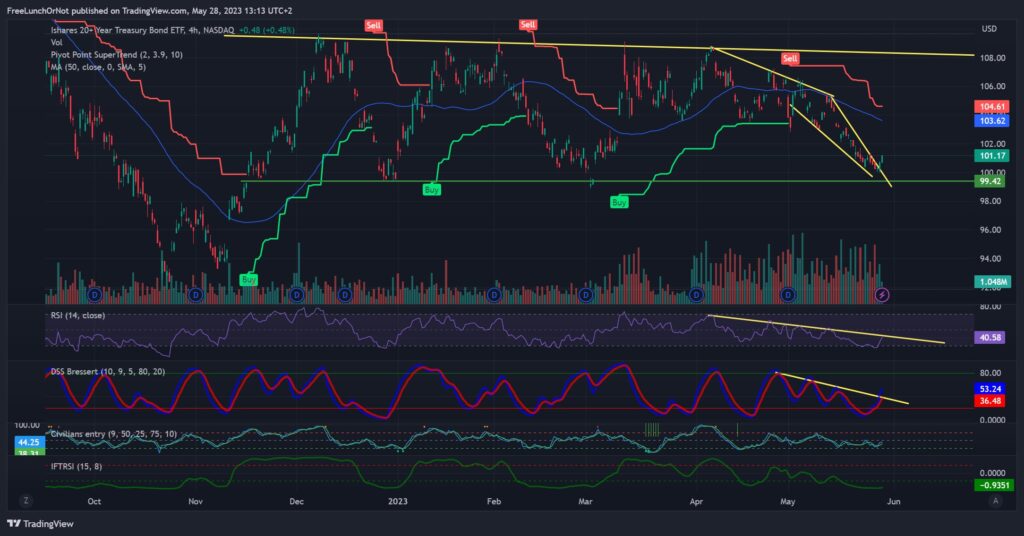 The technical picture: Positive. It appears that US long bonds (using TLT in this example) might have found solid support. Indicators and a declining wedge pattern on the 4hr chart hint at a potential upside opportunity, provided the price maintains its support level. See picture below.