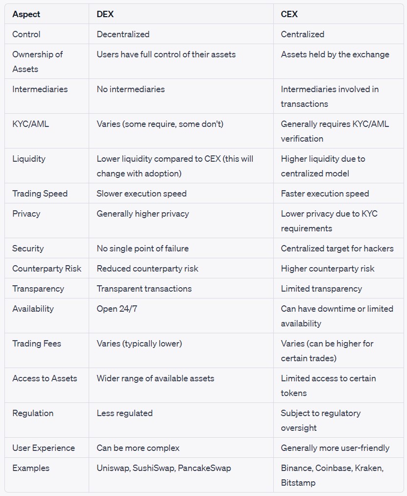 Table1: Comparison of the main characteristics of Decentralized Exchanges (DEX) vs. Centralized Exchanges (CEX)