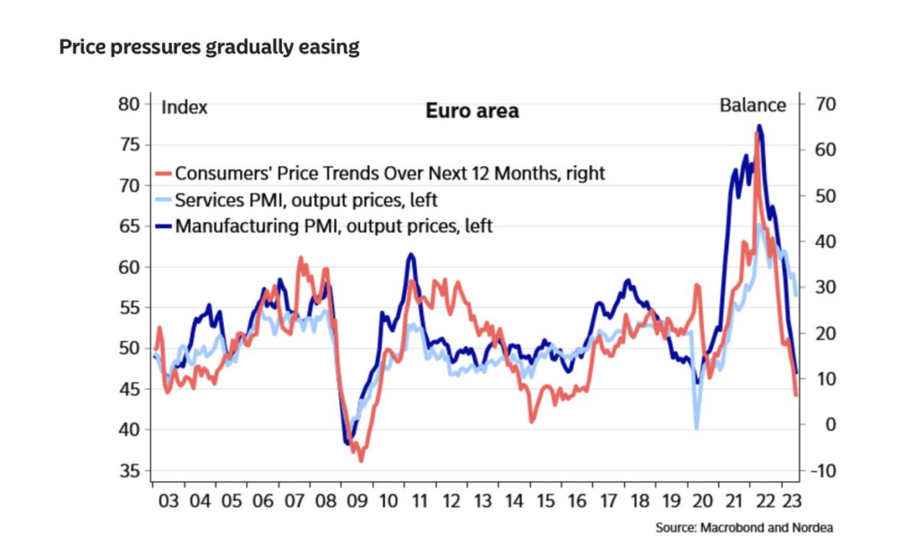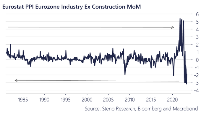 The collapse of the Producer Price Index (PPI) in Europe is a significant development that will likely impact headline inflation in the near future. Central Banks initially underestimated the inflationary risks, and made a delayed shift in policy when a series of aggressive rate hikes followed. However, recent indications suggest a swift momentum shift, making the current hawkish stance increasingly incongruent with evolving market conditions.
